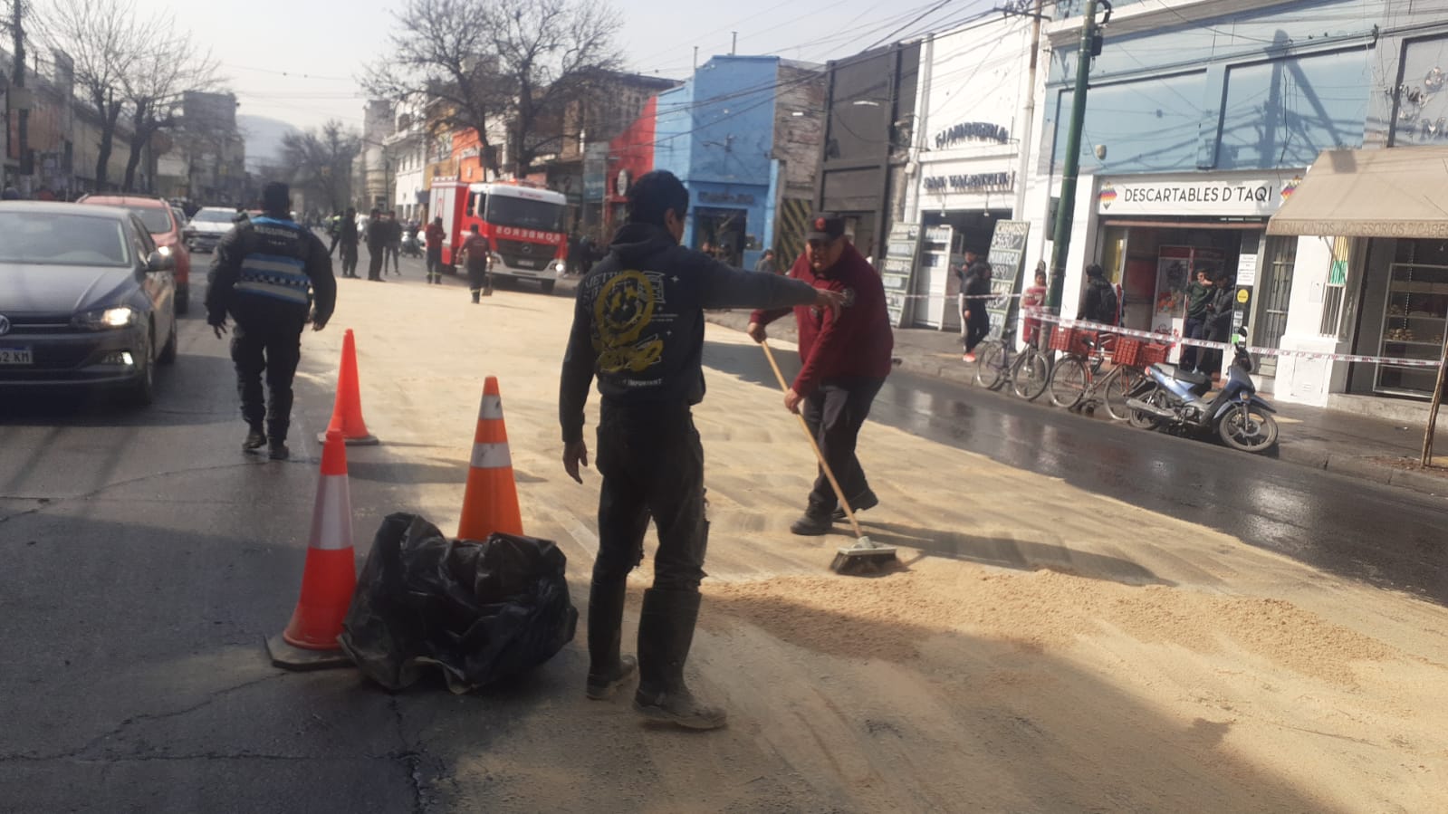Las áreas de Protección Ciudadana y Tránsito y Seguridad Vial trabajan en el lugar. Se están realizando tareas de absorción y barrido en San Martín desde Ituzaingó hasta Mendoza.