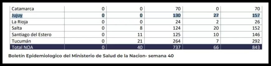 Además señala que desde la Semana Epidemiológica 31, comienzo de la temporada 2024/2025, las provincias de Formosa y Chaco notificaron casos hasta la semana 40 sosteniéndose la circulación viral durante todas las semanas. En este periodo se registraron casos en el departamento Patiño, Capital, Pilcomayo y Pilagás, en la provincia de Formosa; y en el departamento San Fernando, en Chaco. En el resto de las jurisdicciones del país no hay evidencia de circulación viral en el momento actual.